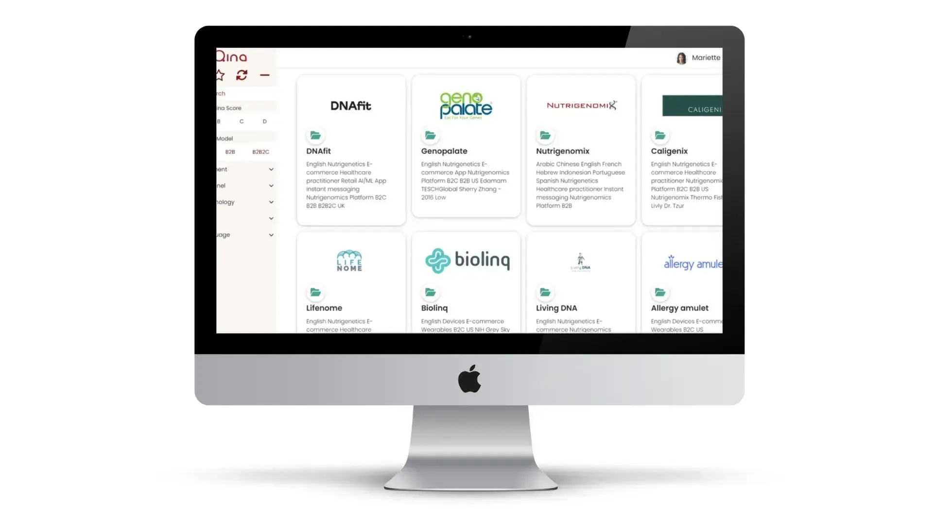 The Qina engine is our very popular service used by executives who need to understand the marketplace and ecosystem, by R & D professionals who are looking for partners as well as by consultants and practitioners who are looking to save time to find information on available Personalized nutrition solutions.